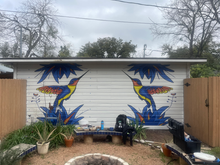 This was a fun private commission I had the honor of working on. I designed and painted the two birds on the side of a backyard shed. Once I started painting, the piece took me three weeks to complete.